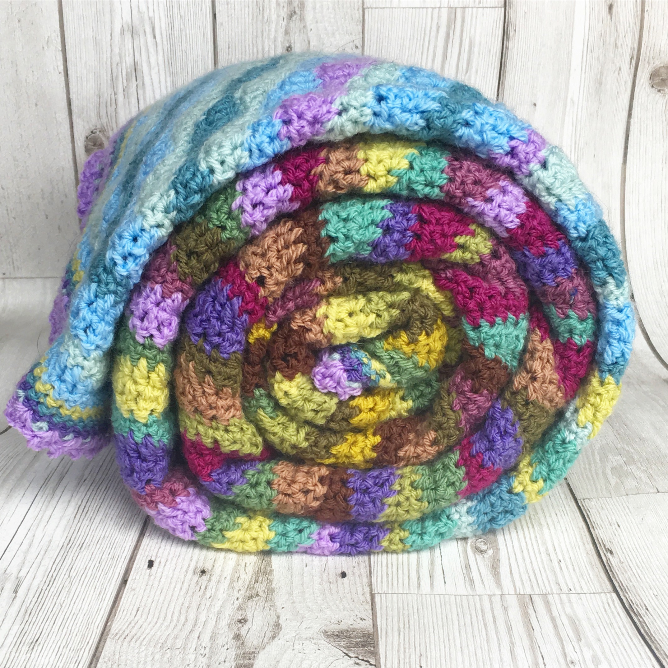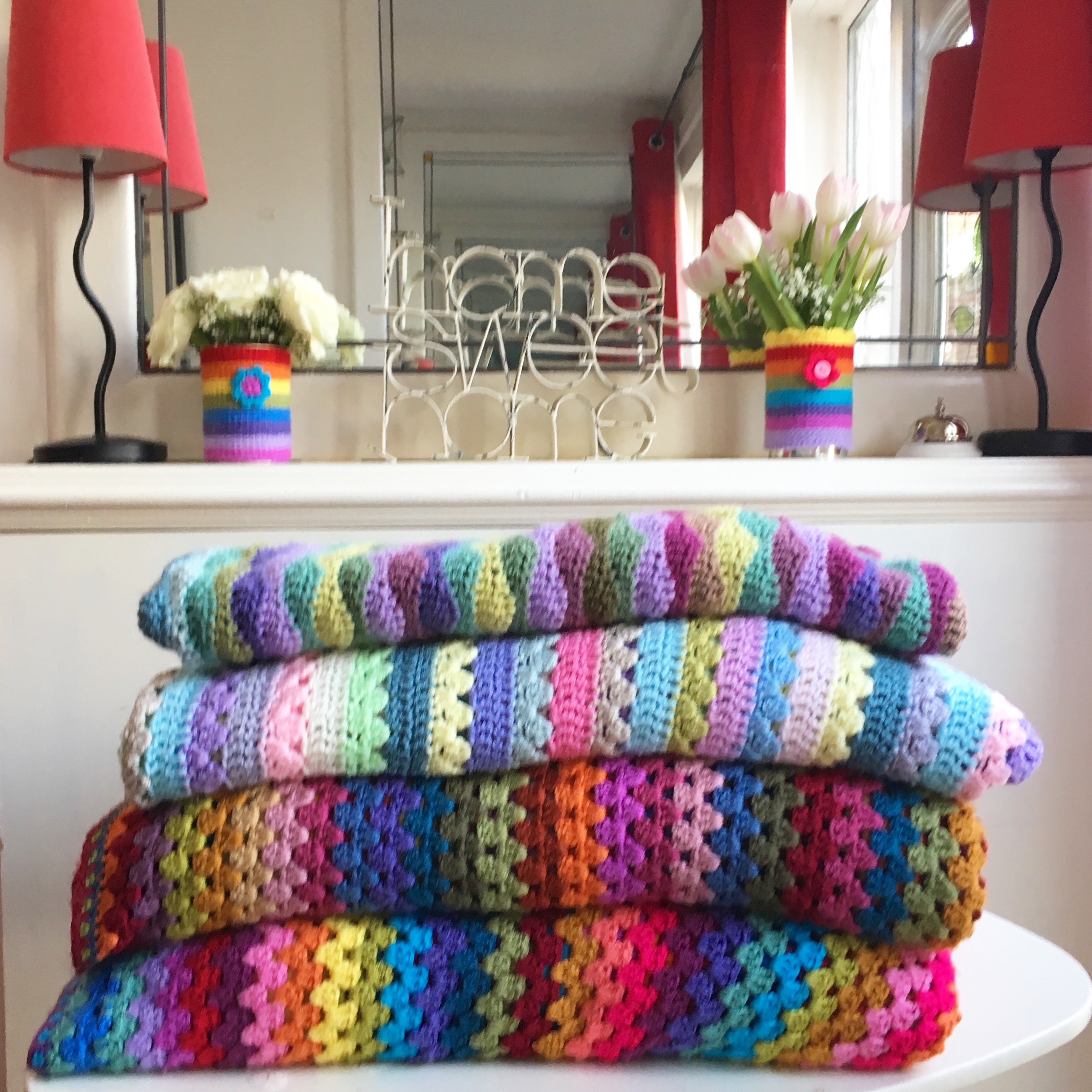 Since I finally learnt how to crochet in 2015 I have been a big fan of the brilliant Attic24 blog. I am such a fan of Lucy’s use of colour and the beautiful patterns she creates. I have so far managed to crochet four of her blanket patterns and a few of the lovely little flowers and birds on her blog as well. If you haven’t discovered Attic24 yet then do go and have a peek, I’m sure you will love it and find so much inspiration there. This week I finished the Moorland Stripe blanket and I love it. The colours are fabulous and I love how Lucy got her inspiration from the moors near her home. Most people find that the sewing in of all the wool ends is their least favourite part of their crocheting but I find it quite relaxing in a way because you don’t need to think too much or concentrate too hard on it. Some people like to sew the ends in as they go along and some, like me, leave them all to the end. Are you a sew them in as you go or a leave them till the end girl? I am sure the answer to that question must say something about our personality types, but perhaps it’s better not to know 🙂