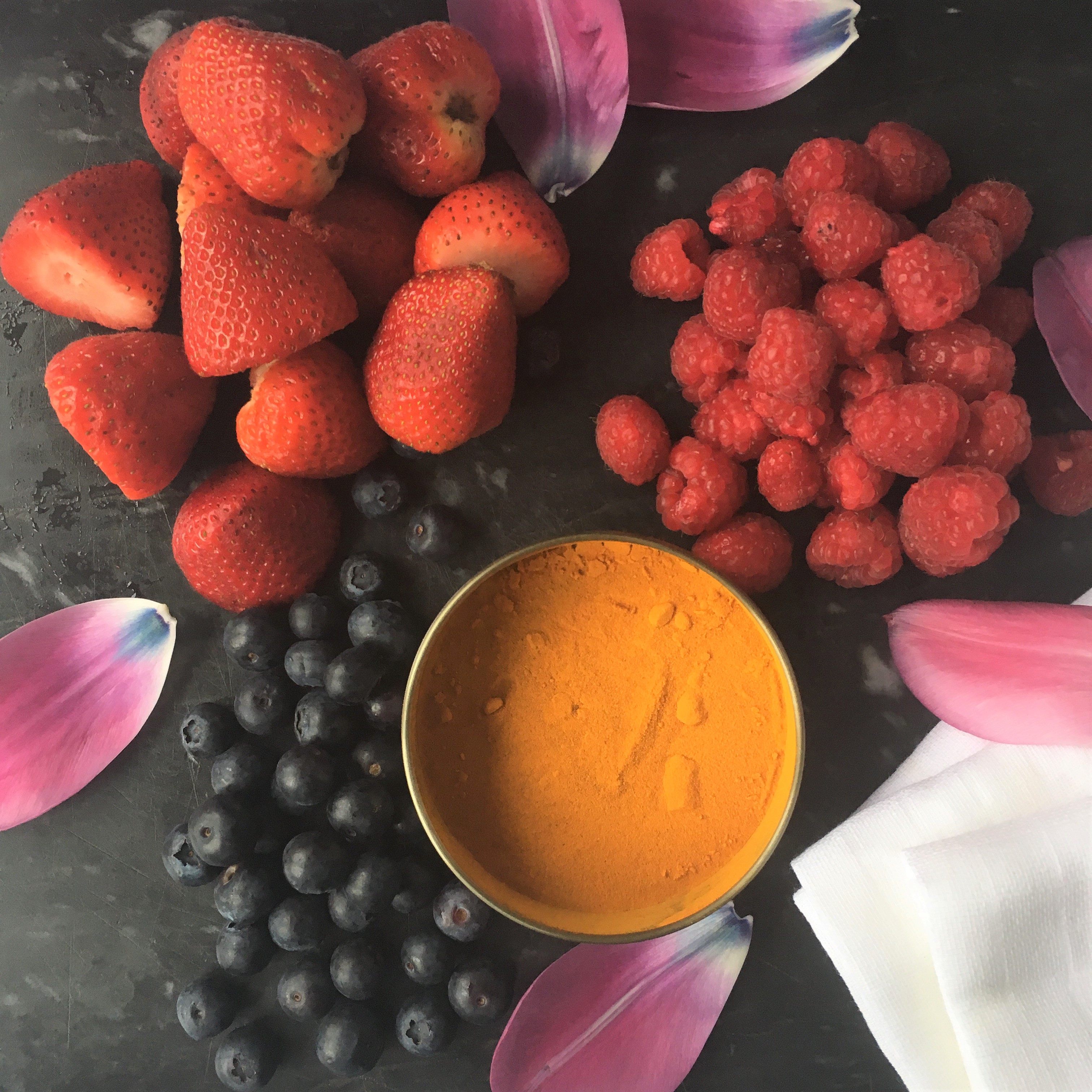 Lately I have been taking some courses from the fabulous Makelight on how to improve my photography for instagram and blogging. It is an amazing, supportive community full of lovely, creative people from all walks of life and I have learnt so much from them all. Having been inspired to add some props to my photos I decided to try my hand at dyeing some beautifully soft muslins using natural dyes and food colourings. It was soooo much fun. I cleared a space on the kitchen island (not an easy task in this house as everything seems to get plonked on there), gathered together whatever I had in the house, which turned out to be some strawberries, raspberries, blueberries, turmeric and food colourings and set to work. The food colourings were easy as that just meant adding a few drops to the water and letting the muslin steep in it for a short time. I then rinsed it out under cold water, wrung it out and hung on the line to dry. I tried out gel colours and liquid colours and I would have to say that I definitely got a more even result from the liquid colours as the gel seemed to leave darker spots on the muslin where it hadn’t quite completely dissolved but I quite like the effect anyway and will definitely use it.