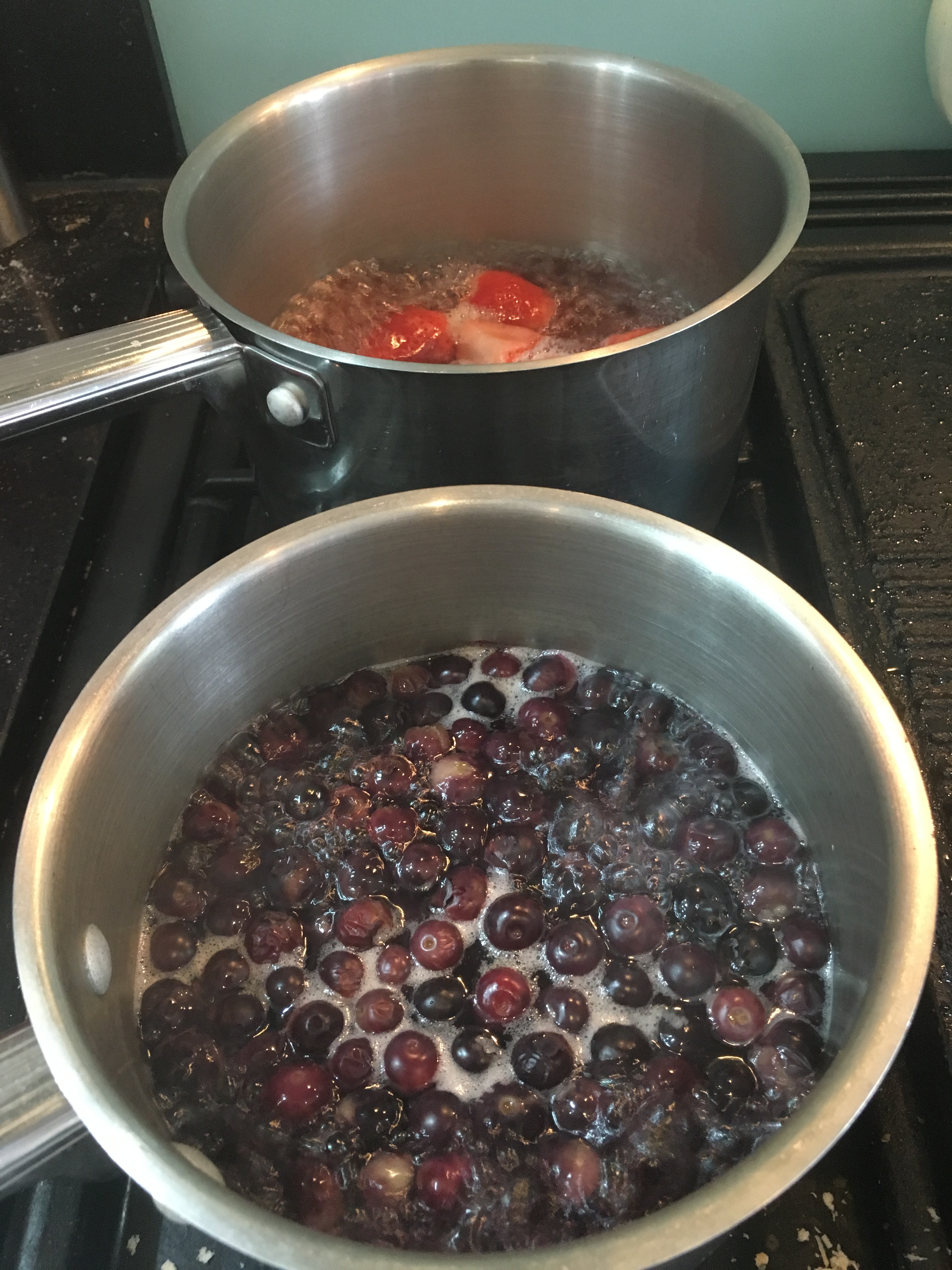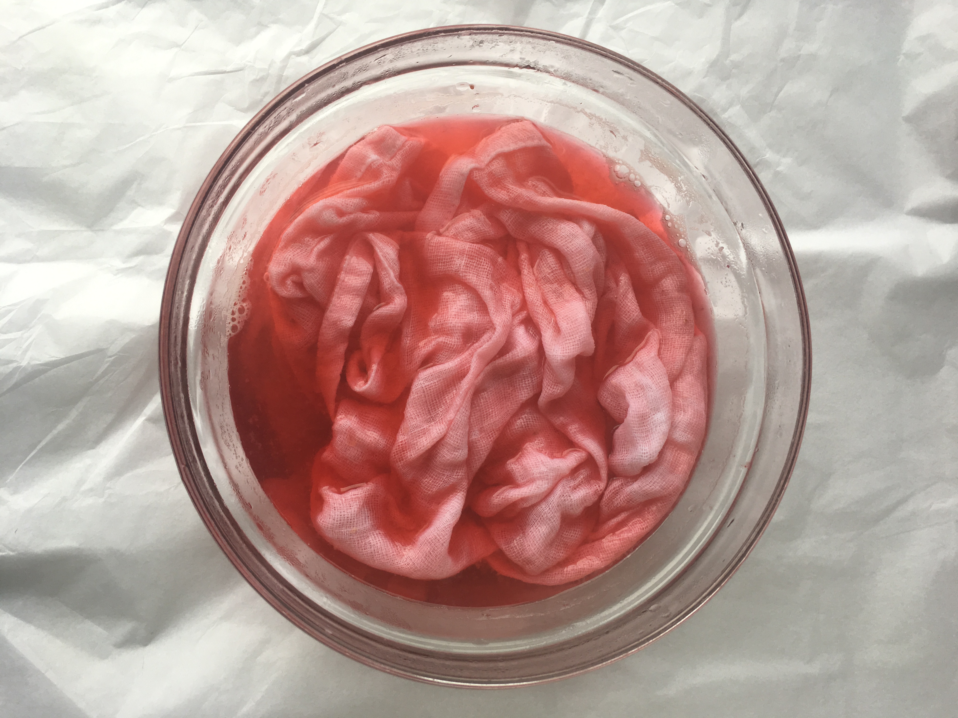 Next I got started on the natural dyes. I put the fruits in different pans on the hob and covered them with a little water and let them boil until the fruit started to break down. At this point I mashed them down a little to get more colour out and let them bubble gently for a few more minutes before straining the liquid into a bowl, making sure to squeeze every last drop of juice out of the fruity pulp in the sieve. I added the muslin to the bowl and allowed to steep for a short while before rinsing under cold water, wringing out and hanging on the line to dry.