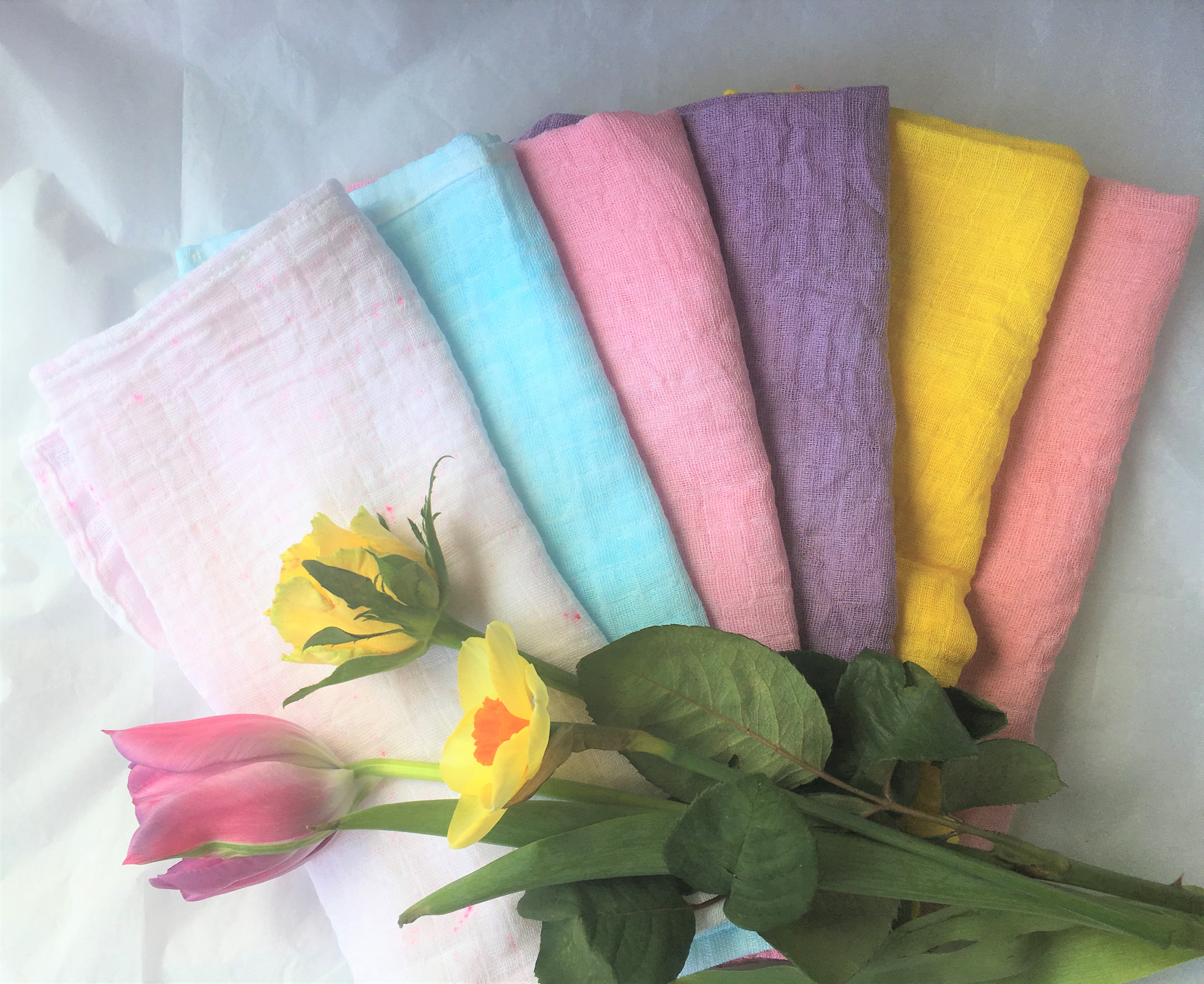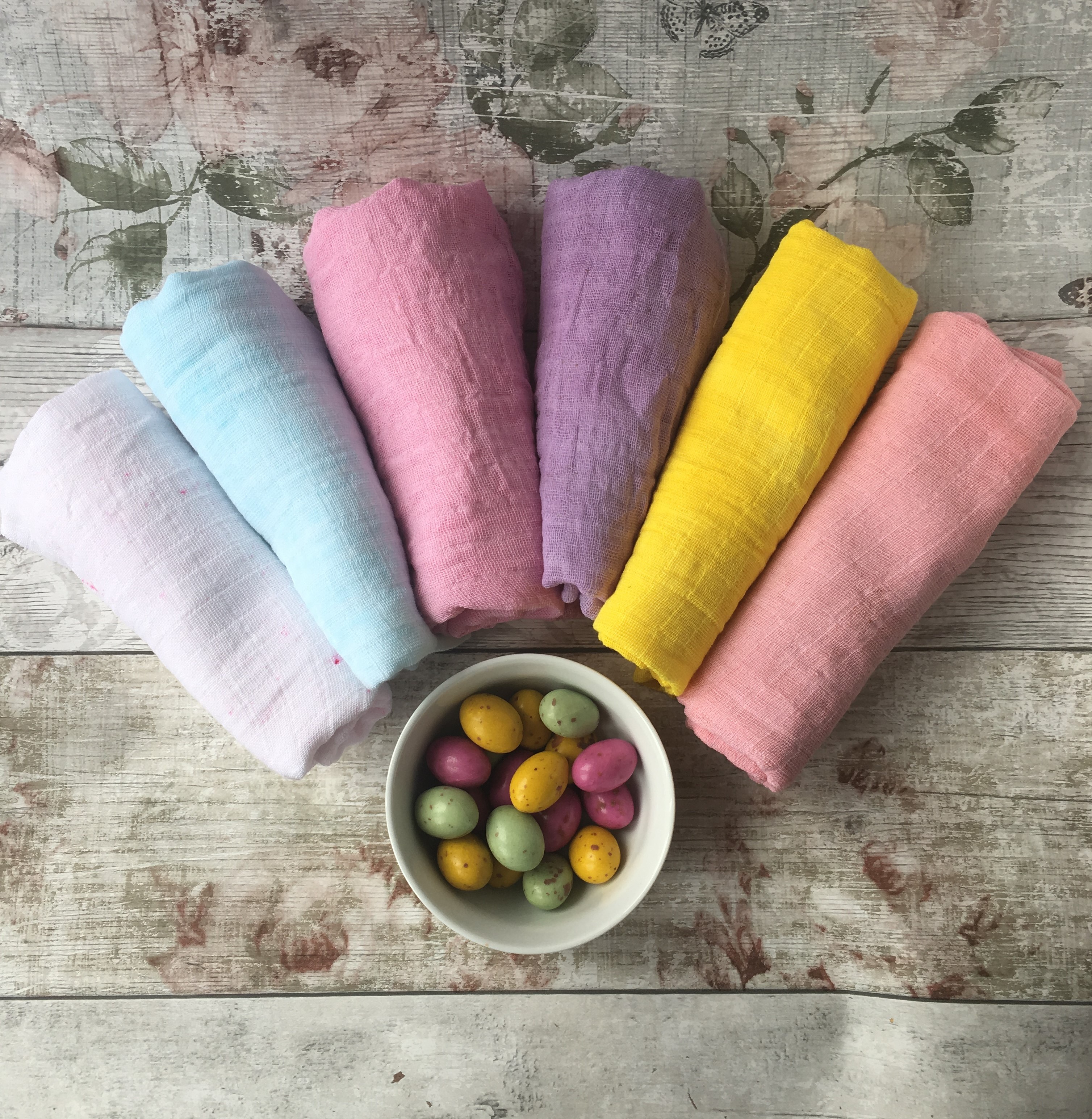 The food colourings were easy as that just meant adding a few drops to the water and letting the muslin steep in it for a short time. I then rinsed it out under cold water, wrung it out and hung on the line to dry. I tried out gel colours and liquid colours and I would have to say that I definitely got a more even result from the liquid colours as the gel seemed to leave darker spots on the muslin where it hadn’t quite completely dissolved but I quite like the effect anyway and will definitely use it.