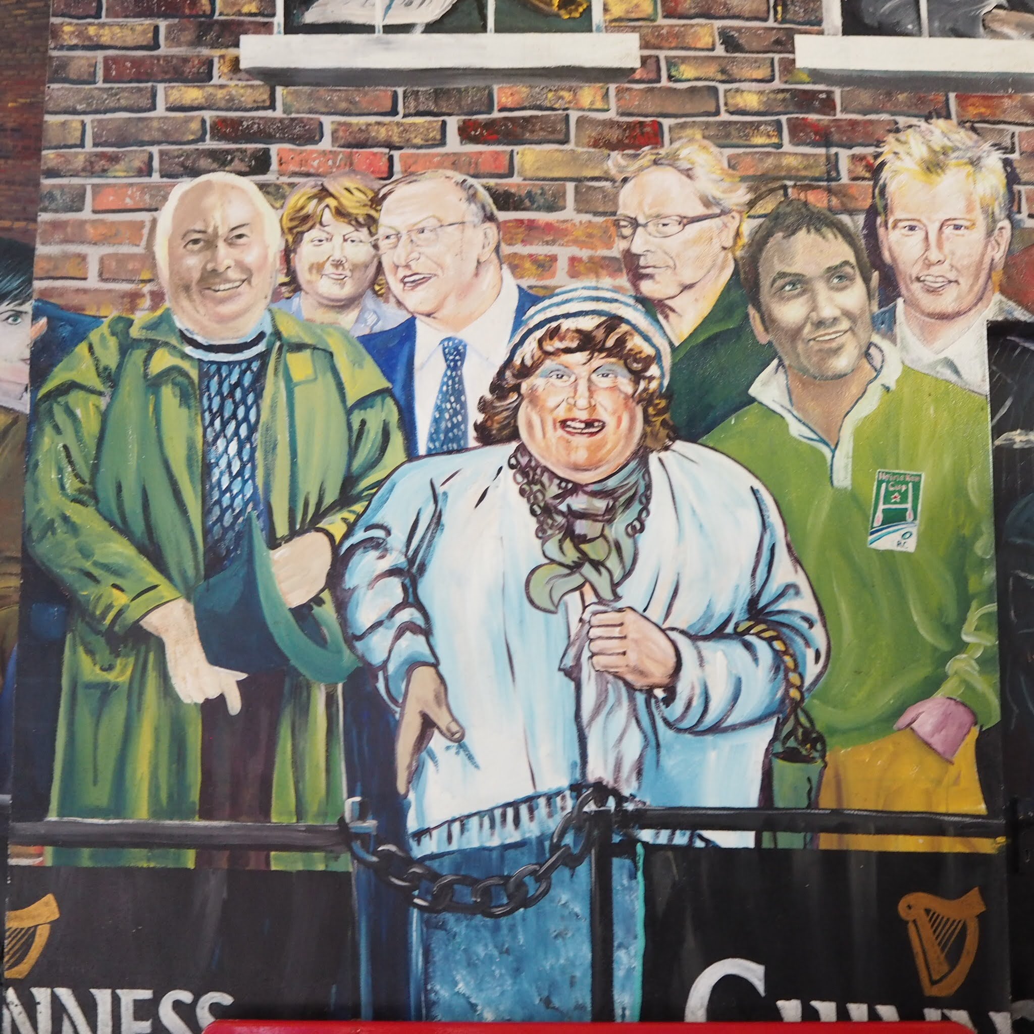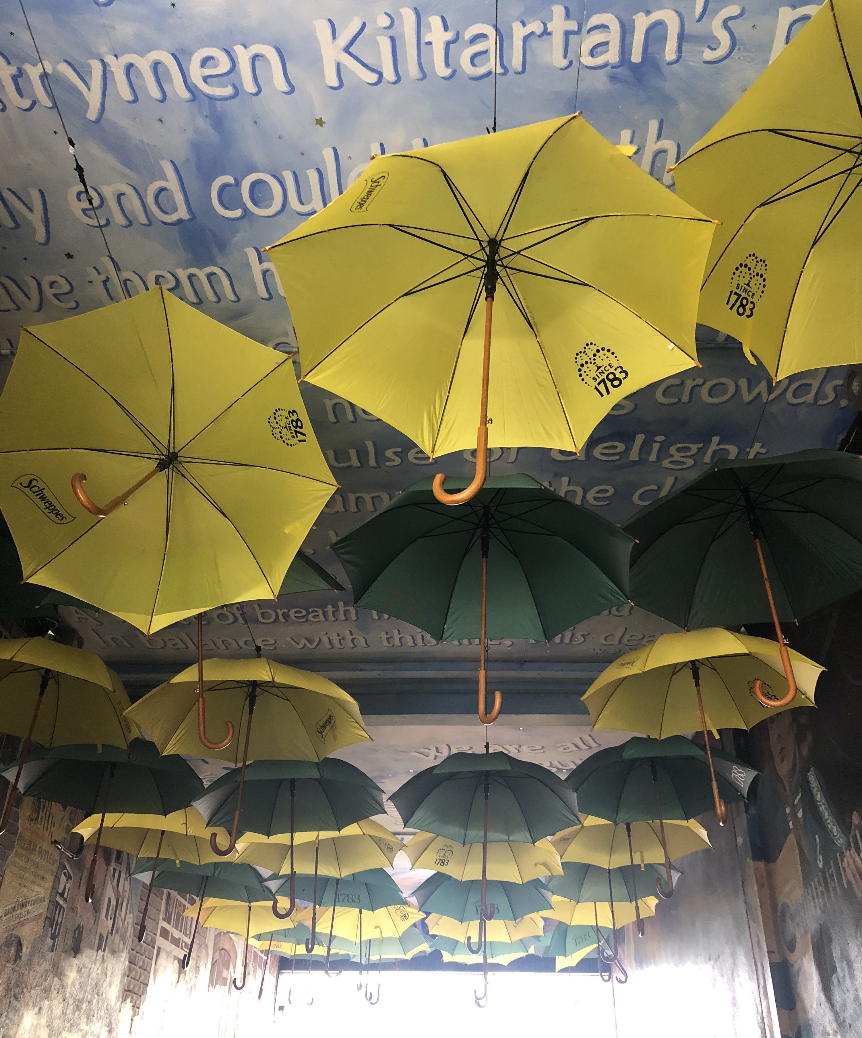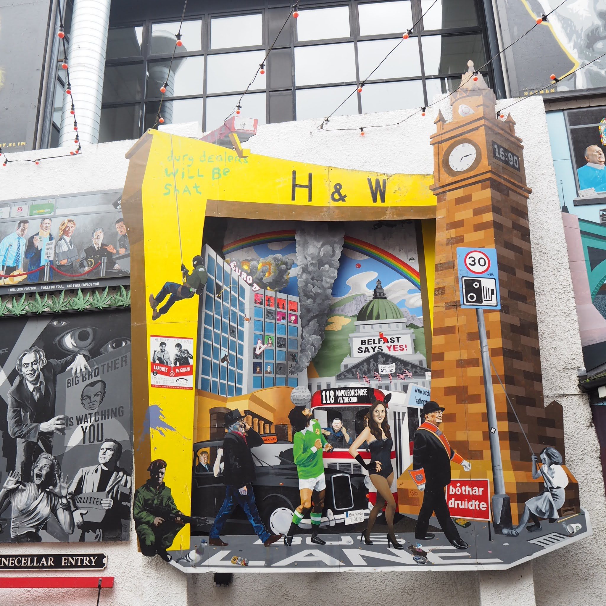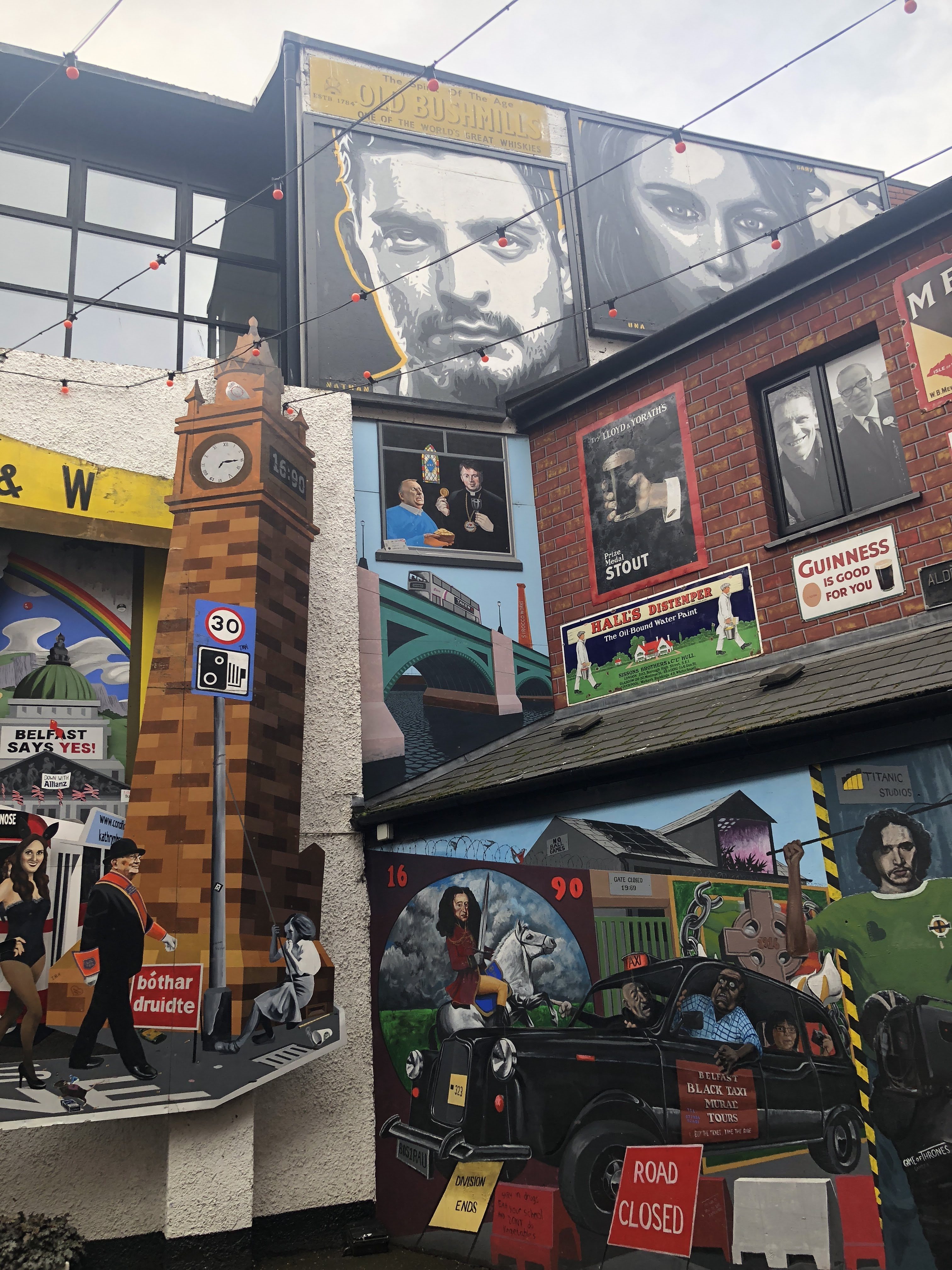 Just a little further on is Commercial Court where an almost hidden alleyway festooned with umbrellas takes you into a small courtyard full of fabulous street art. You could spend ages looking at these amazing artworks and each time you look you discover another of Belfast’s famous faces such as George Best, Van Morrison, Jamie Dornan and scenes that depict moments from the City’s past.