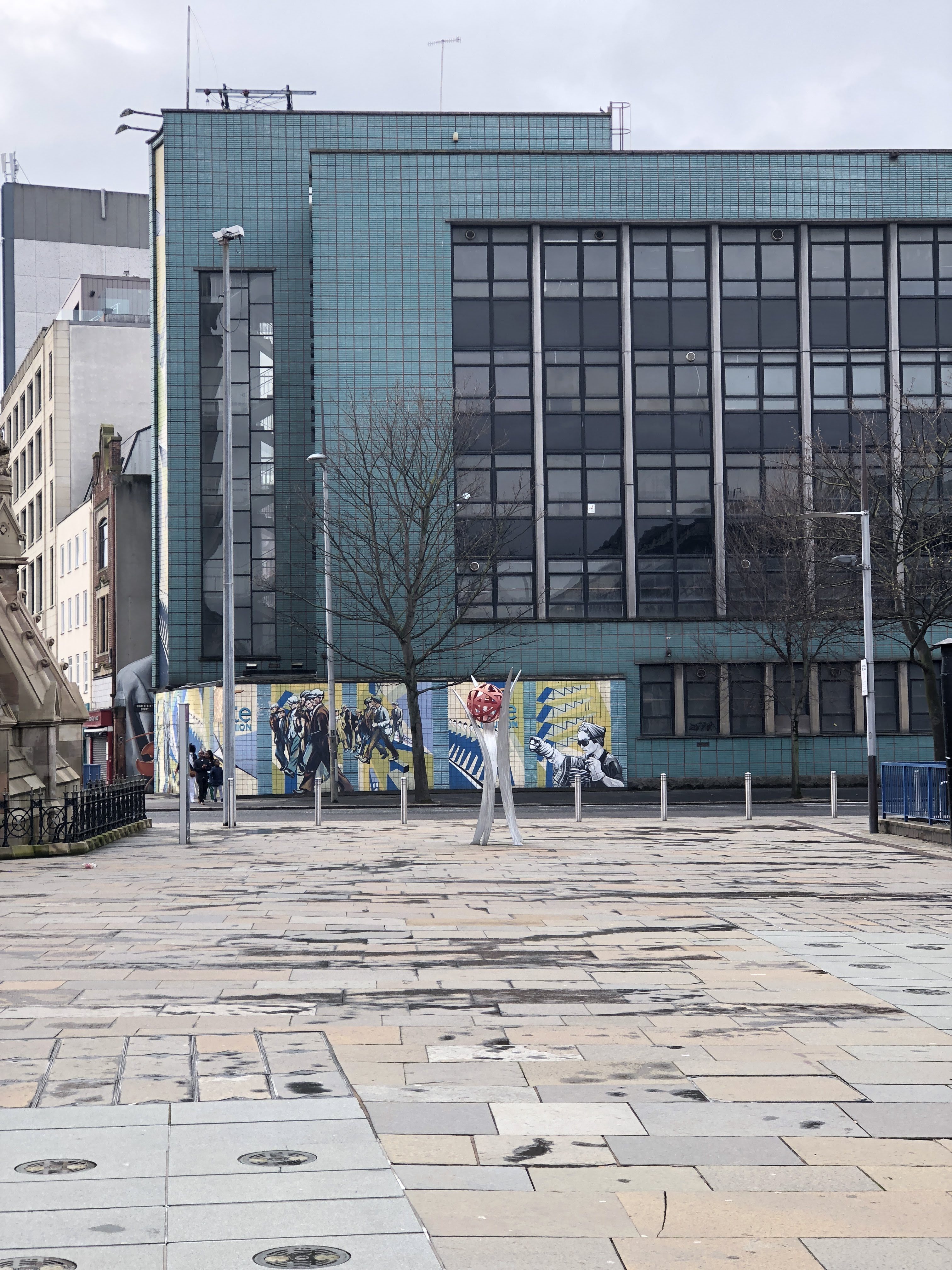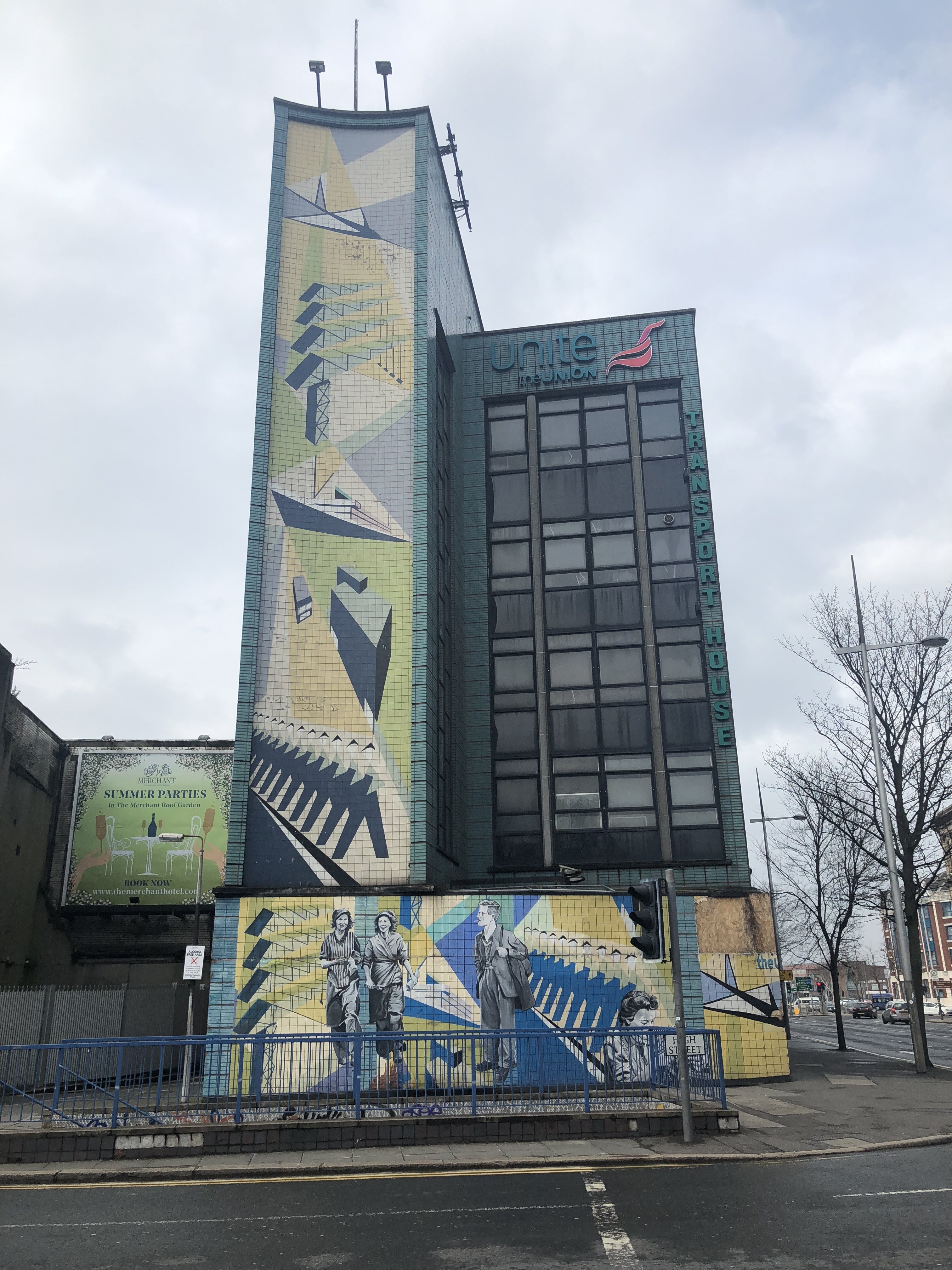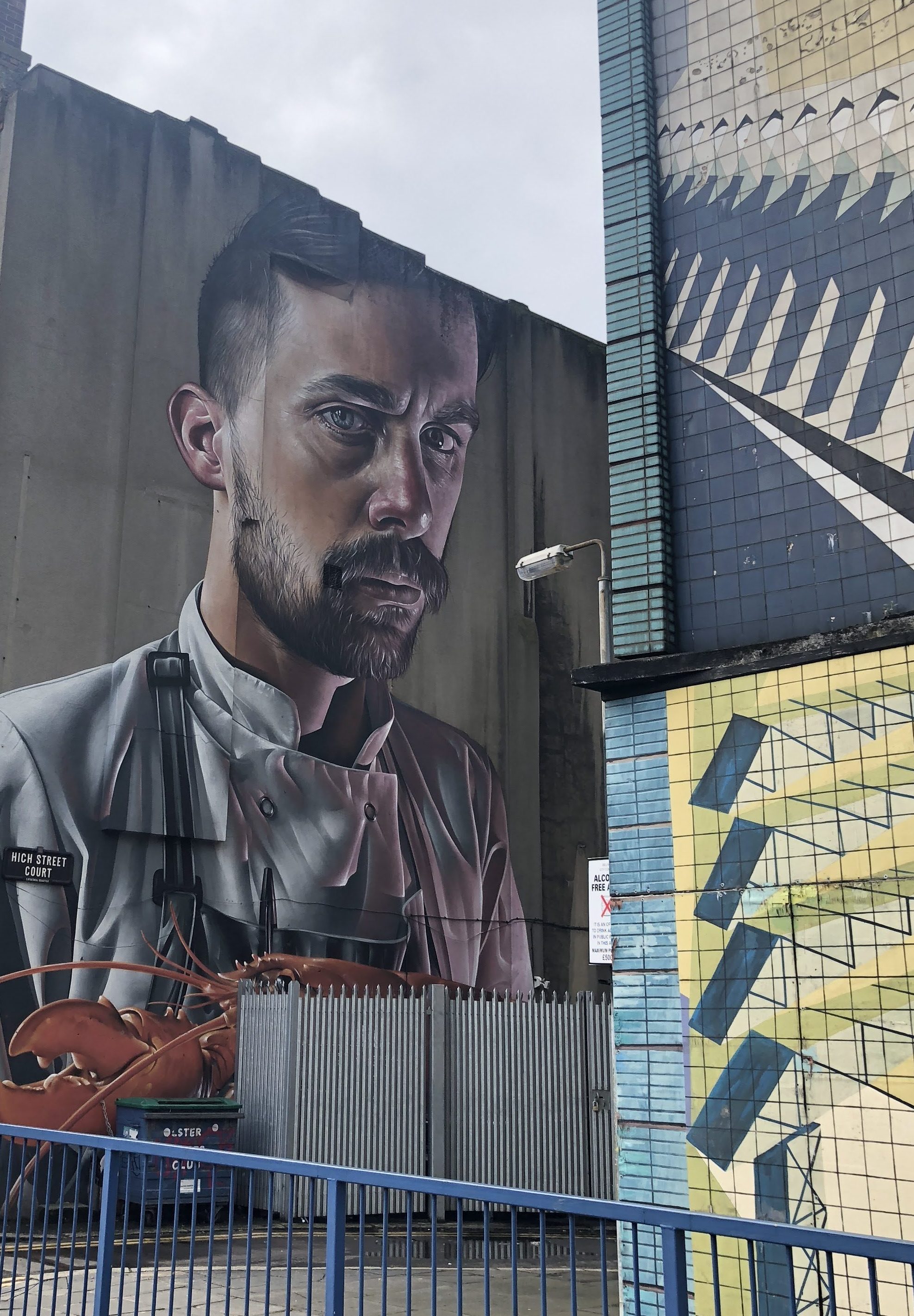 Heading towards the Cathedral Quarter we passed Transport House. This building was the headquarters of the Amalgamated Transport & General Workers Union and I have to admit I have always thought of it as an eyesore with it’s giant tiles mosaic depicting some of the industries associated with Belfast. It was listed in 1994 and is one of the youngest listed buildings in Belfast. It was reported back in 2015 that the Unite Union were going to renovate the building and relocate their HQ back there, but we shall have to wait and see. Just beside it is a very large wall mural by an Australian street artist called Smug One. The mural is reffed to locally as the Lobster Chef, and is just one of a growing number of pieces of street art in the city.