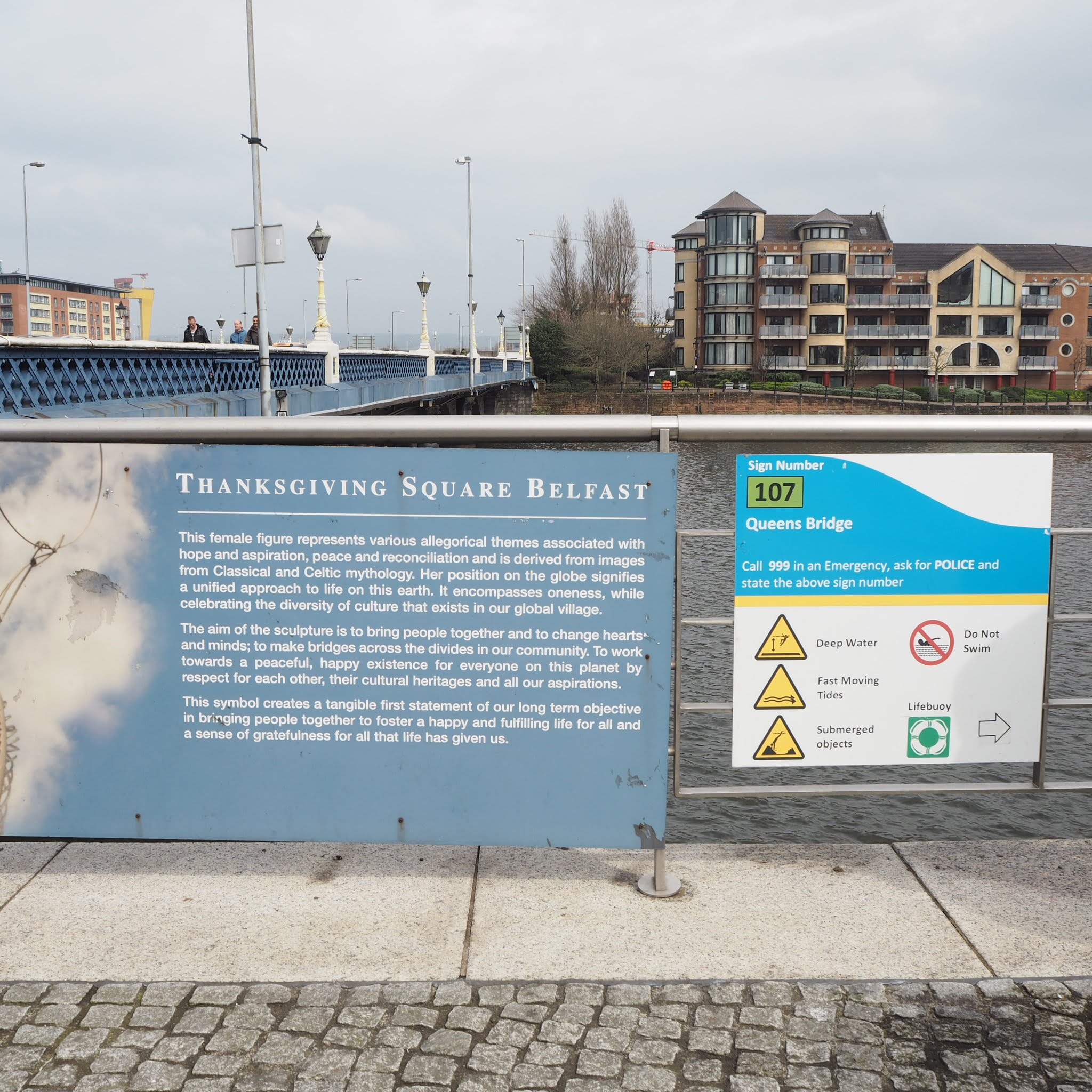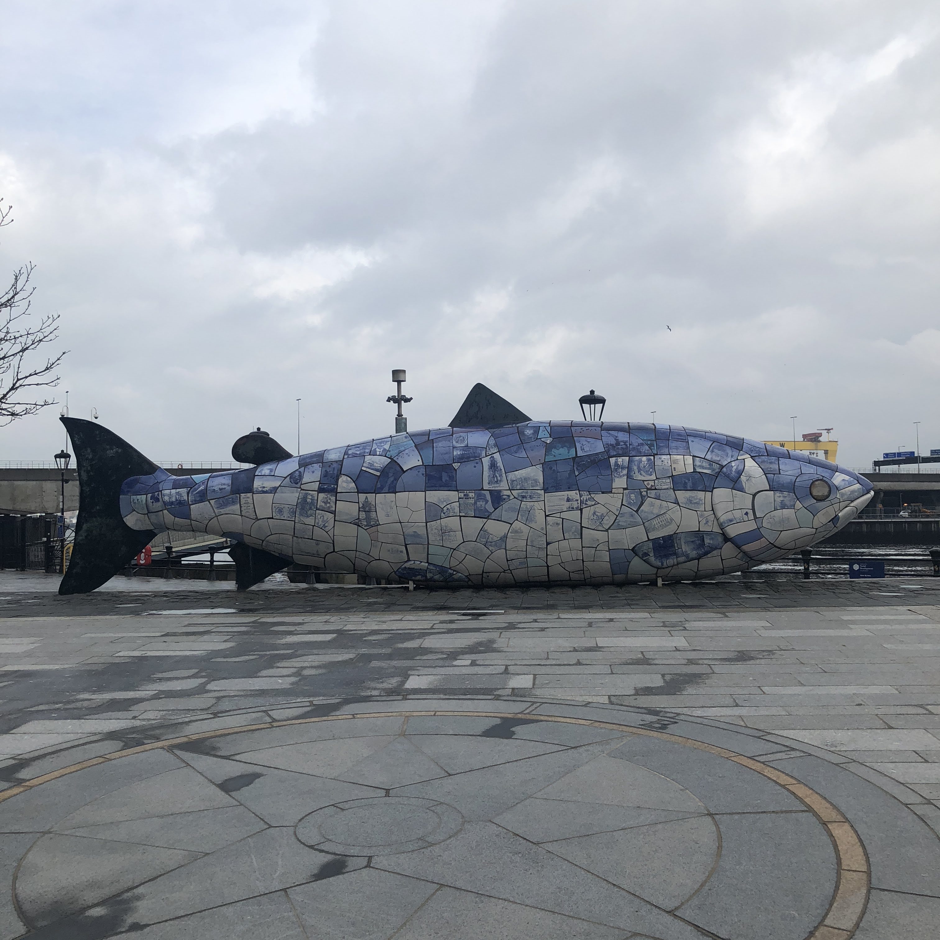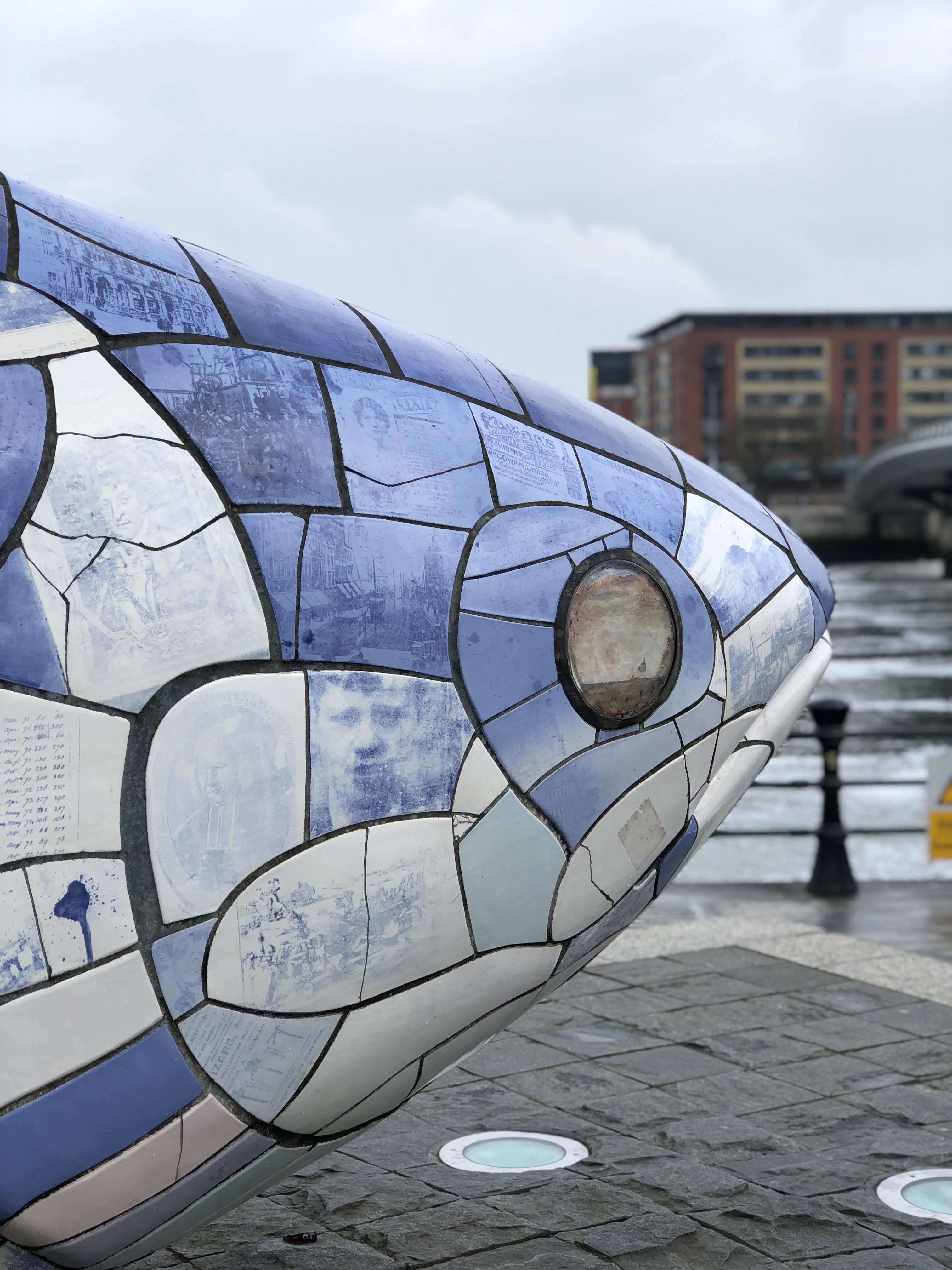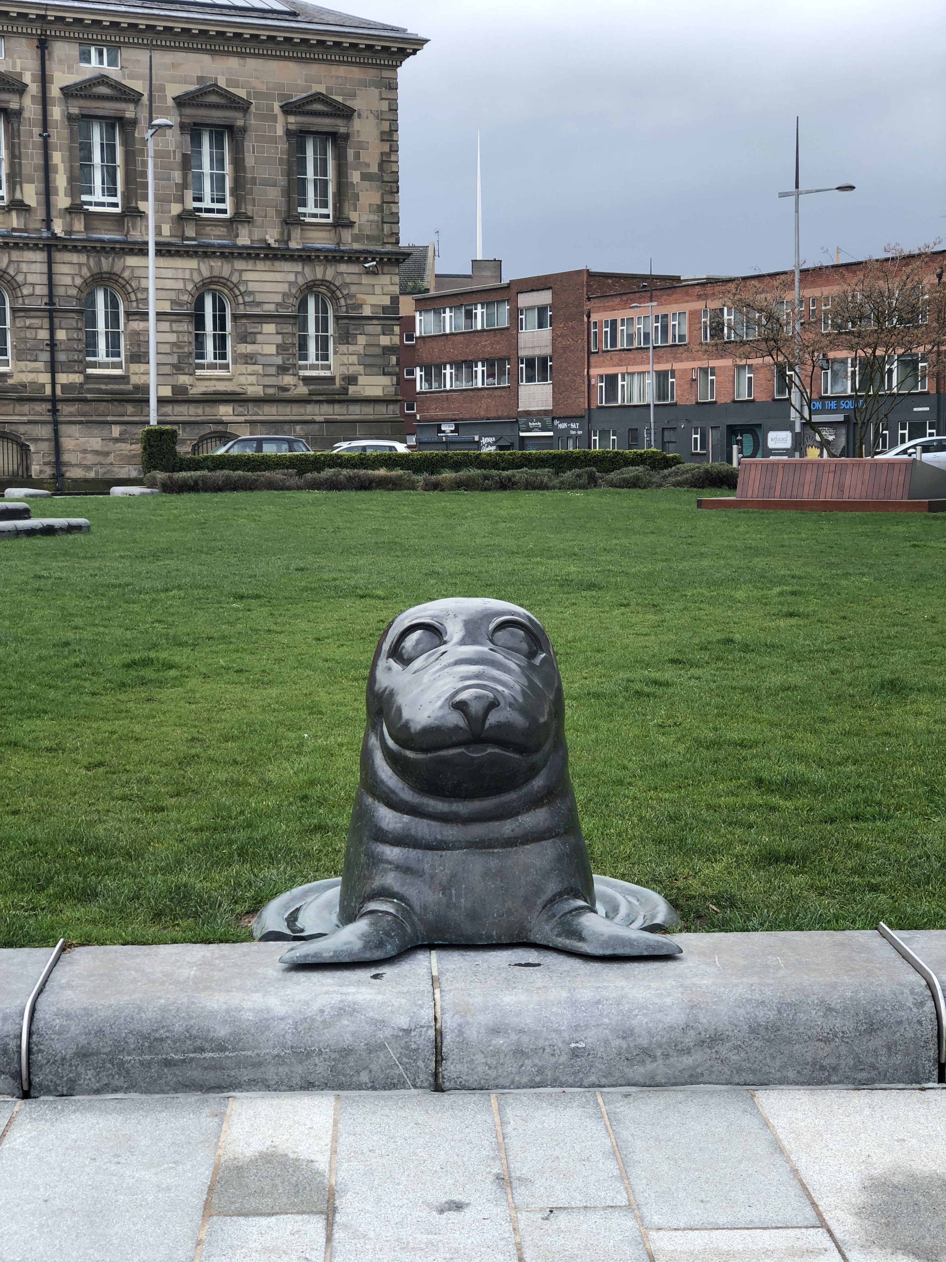 Just across the road from Thanksgiving Square is the Big Fish, also known as the Salmon of Knowledge. This is a 10m long sculpture by John Kindness. The surface is covered in ceramic tiles decorated with images and text depicting scenes from Belfast’s history. Inside the Big Fish is a time capsule containing information, stories and poetry about the city. The location of this sculpture marks the confluence of the River Lagan and the River Farset and it was commissioned to mark the regeneration of the River Lagan. Just beside the Big Fish is Sammy the Seal, which actually refers to the statues of three seals which represent the family of seals that live in the estuary.